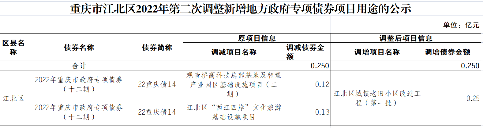 重慶市江北區2022年第二次調整新增地方政府專項債券項目用途的公示
