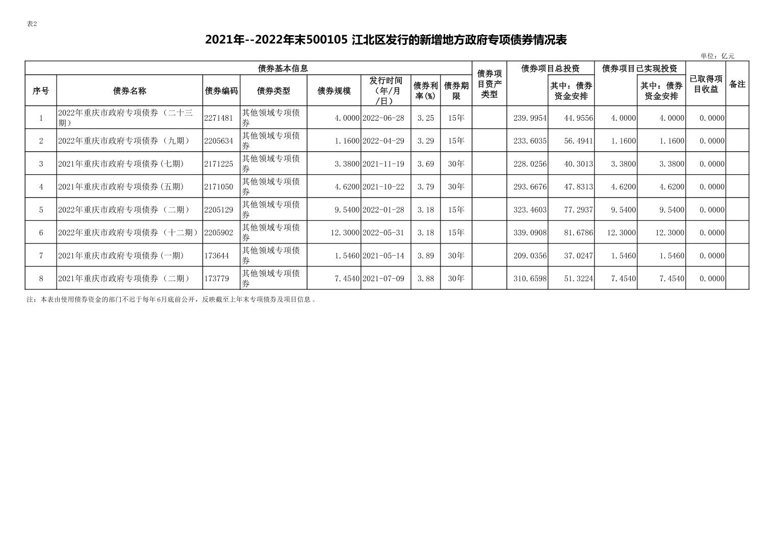2021年--2022年末500105 江北區(qū)發(fā)行的新增地方政府專項(xiàng)債券情況表