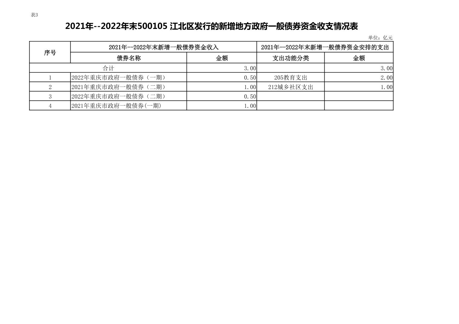 2021年--2022年末500105 江北區發行的新增地方政府一般債券資金收支情況表