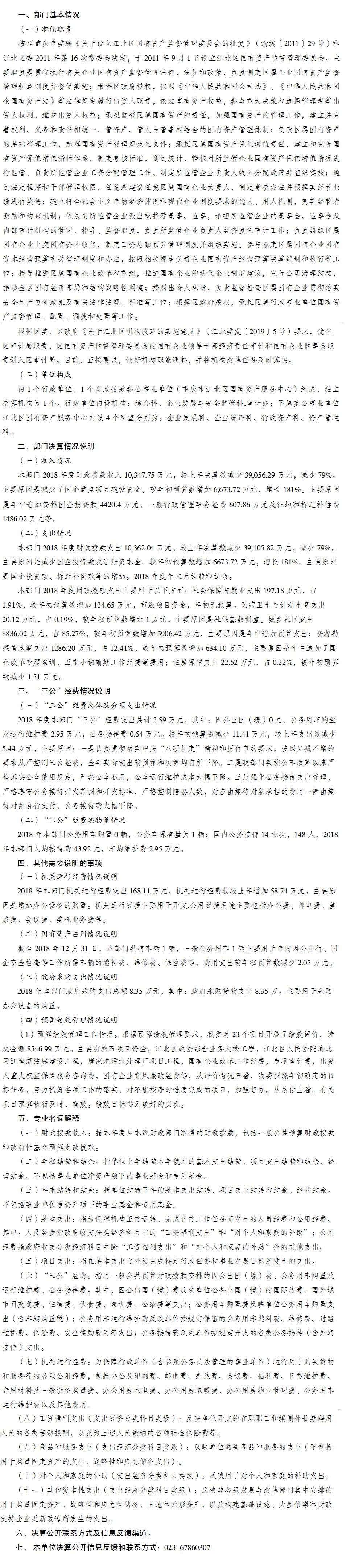 重慶市江北區國有資產監督管理委員會2018年部門決算情況說明