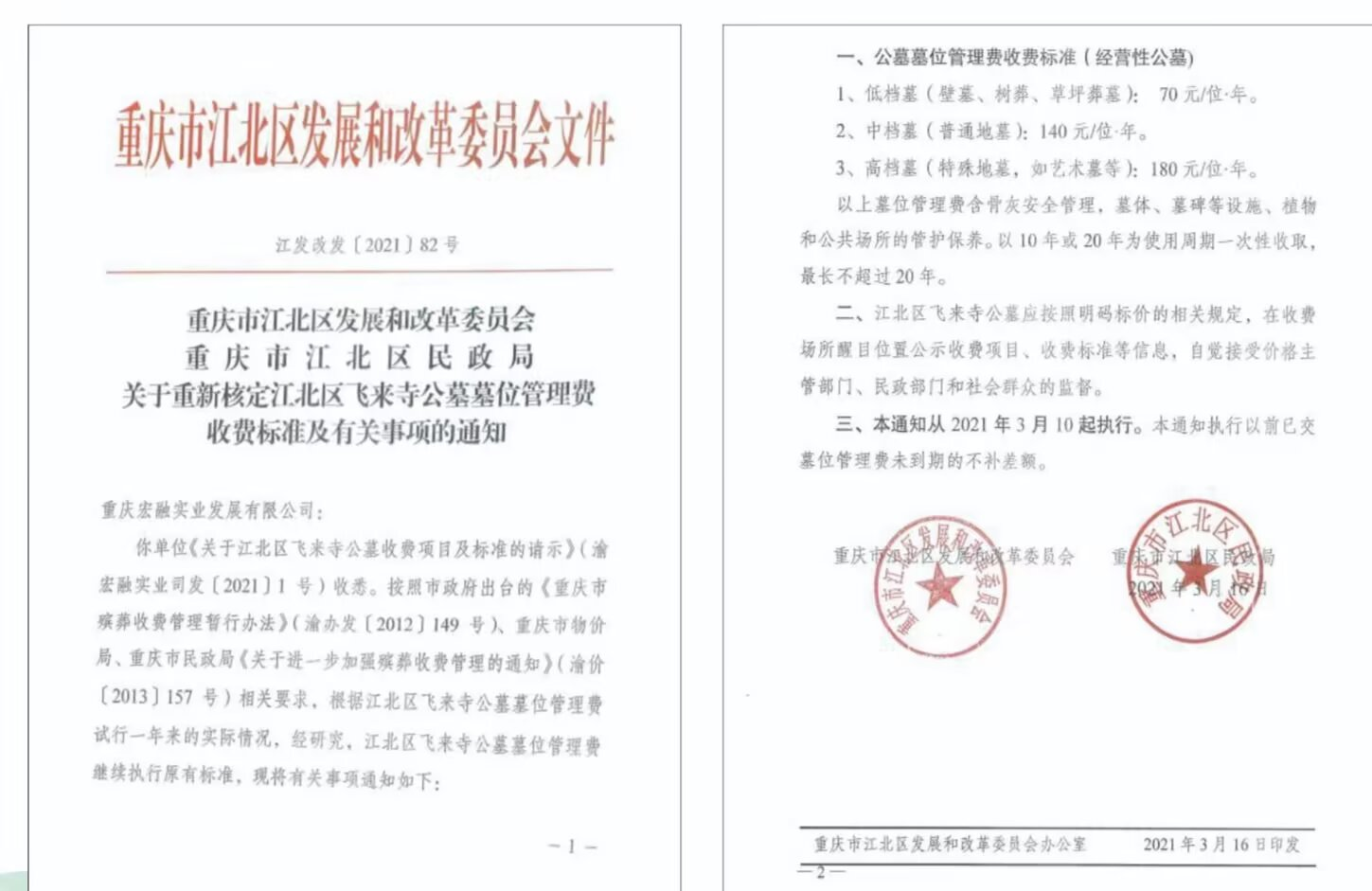 《重慶市江北區(qū)發(fā)展和改革委員會(huì)重慶市江北區(qū)民政局關(guān)于重新核定江北區(qū)飛來寺公墓墓位管理費(fèi)收費(fèi)標(biāo)準(zhǔn)及有關(guān)事項(xiàng)的通知》(江發(fā)改發(fā)﹝2021﹞82號(hào)) |