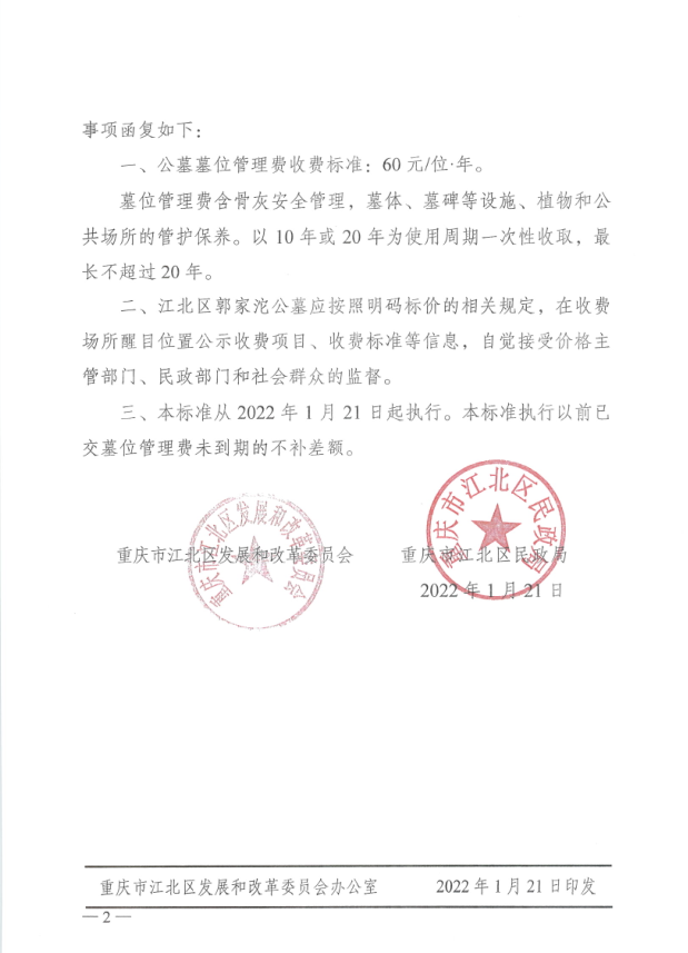 《重慶市江北區(qū)發(fā)展和改革委員會(huì)重慶市江北區(qū)民政局關(guān)于重新核定江北區(qū)郭家沱公墓墓位管理費(fèi)收費(fèi)標(biāo)準(zhǔn)及有關(guān)事項(xiàng)的通知復(fù)函》江發(fā)改發(fā)﹝2022﹞21號(hào) |