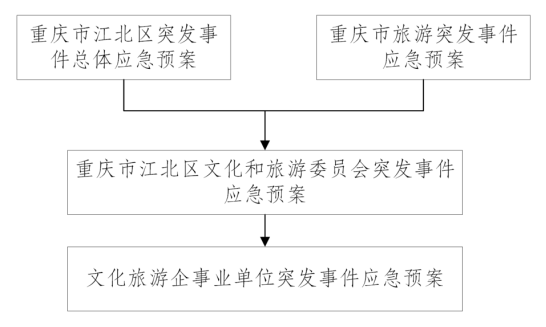 本預案向上銜接《重慶市江北區突發事件總體應急預案》及《重慶市旅游突發事件應急預案》,各文化旅游企事業單位制定的預案與本預案相銜接。