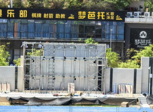 培新小學(xué)操場(chǎng)主席臺(tái)背景墻處準(zhǔn)備安裝LED顯示屏,事發(fā)時(shí)已搭設(shè)好擬安裝LED顯示屏的鍍鋅鋼管架,鍍鋅鋼管架用“工字鋼”固定在背景墻上,鋼管架長(zhǎng)約10米,高約6米。在鋼管架離地高約4米左右的位置,設(shè)置有第二層維護(hù)平臺(tái),維護(hù)平臺(tái)長(zhǎng)約9.5米,寬約0.7米;維護(hù)平臺(tái)后側(cè)緊靠背景墻,前側(cè)未設(shè)置防護(hù)欄。第二層維護(hù)平臺(tái)上方的背景墻上有安裝好二個(gè)空調(diào)室內(nèi)機(jī)掛板,第三個(gè)掛板(從右向左)未安裝完成,呈傾斜狀。