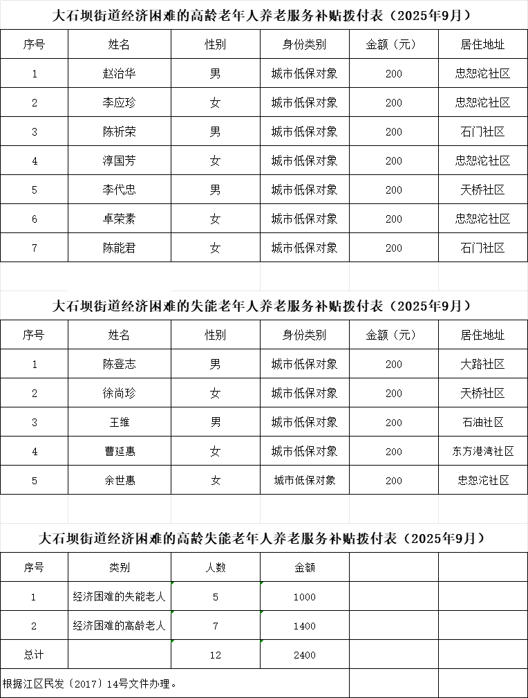 大石壩街道2025年9月經(jīng)濟(jì)困難的高齡和失能老年人養(yǎng)老服務(wù)補(bǔ)貼撥付表