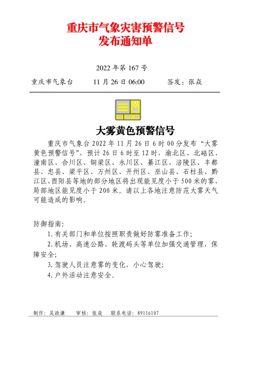 重慶市氣象災害預警信號發布通知單(2022年第167號)