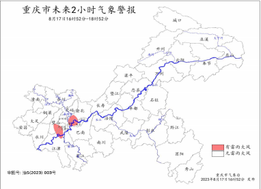 市氣象臺2023年8月17日16時52分發布雷雨大風警 報,預計未來2小時內渝中區、沙坪壩區、大渡口區、江北區、九龍坡區、南岸區、兩江新區、高新區、渝北區、北碚區、巴南區、璧山區、江津區將出現 8 級以上雷雨大風,伴有雷電、短時強降水,請注意防范。